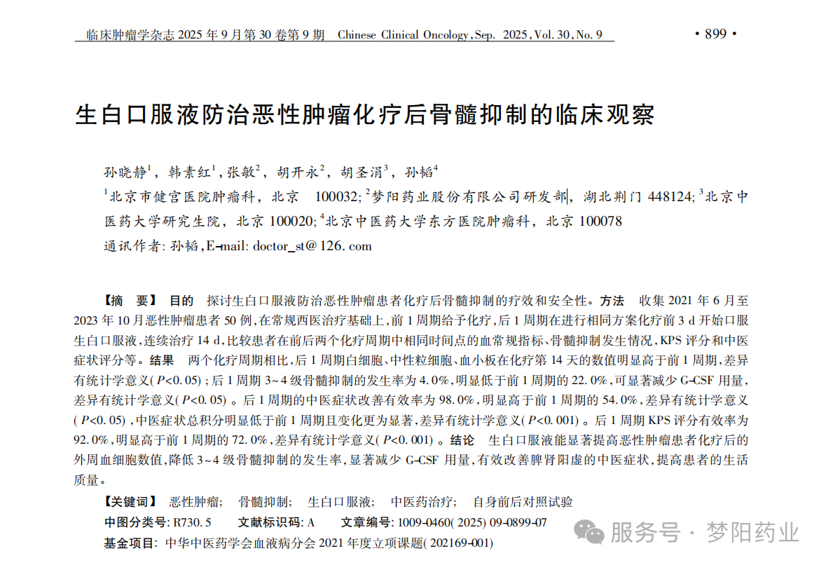 近日,中华中医药学会血液病分会2021年度立项课题( 202169-001)“生白口服液防治恶性肿瘤化疗后骨髓抑制的临床观察”在《临床肿瘤...