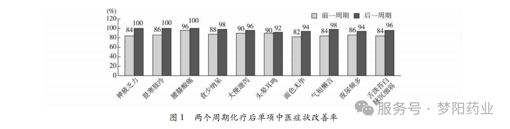 结果 两个化疗周期相比,后1周期白细胞、中性粒细胞、血小板在化疗第14天的数值明显高于前1周期,差异有统计学意义(P<0. 05) ; 后1周期3~ 4级骨髓抑制的发生率为4. 0%,明显低于前1周期的22. 0%,可显著减少G-CSF用量,差异有统计学意义(P<0. 05) 。后1周期的中医症状改善有效率为98. 0%,明显高于前1周期的54. 0%,差异有统计学意义(P<0. 05) ,中医症状总积分明显低于前1周期且变化更为显著,差异有统计学意义(P<0. 001) 。后1周期KPS评分有效率为92. 0%,明显高于前1周期的72. 0%,差异有统计学意义(P<0. 001) 。