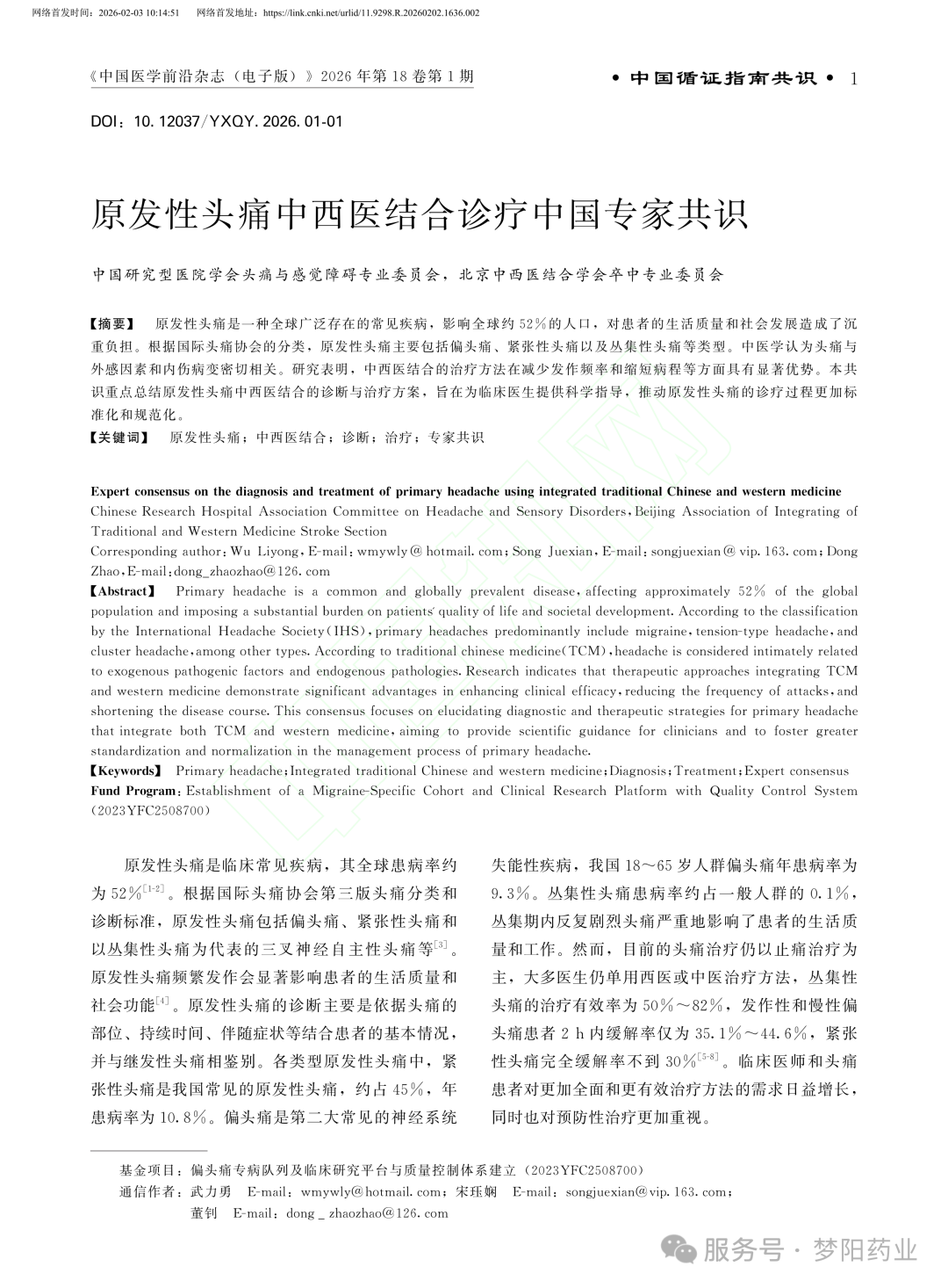 祝贺梦阳药业“大川芎片”纳入《原发性头痛中西医结合诊疗中国专家共识》